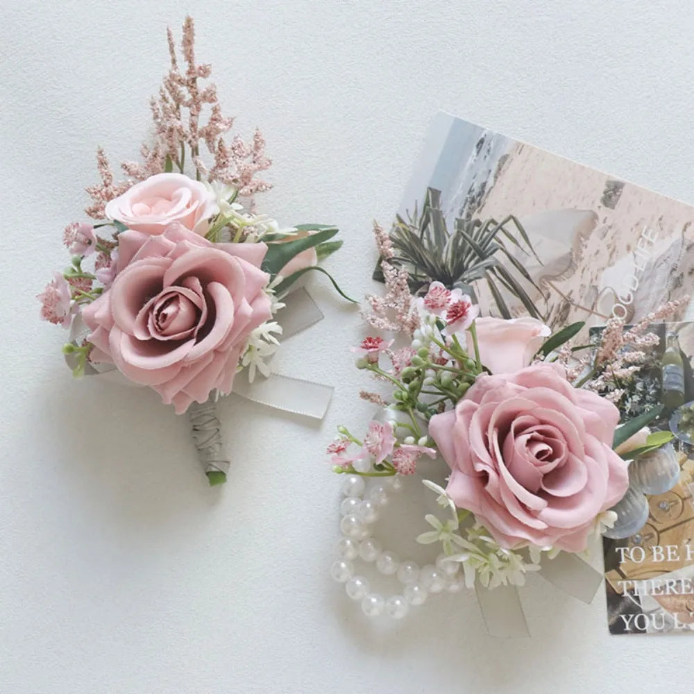 Complete your wedding look with this elegant pink wedding boutonniere and corsage set. Designed for the bridegroom, bride, and bridesmaids, this floral accessory set adds a romantic and coordinated touch to wedding ceremonies and special celebrations.